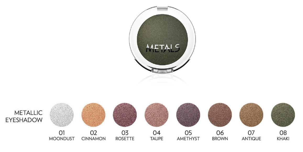 Metalické oční stíny s kovově lesklým efektem. Velmi dobře a rovnoměrně se nanáší, májí dlouhodobou trvanlivost. Nalíčení vydrží po celý den či noc. Můžou být použity k získání jemného, světelného efektu nebo silnějšího, výrazného lesku.